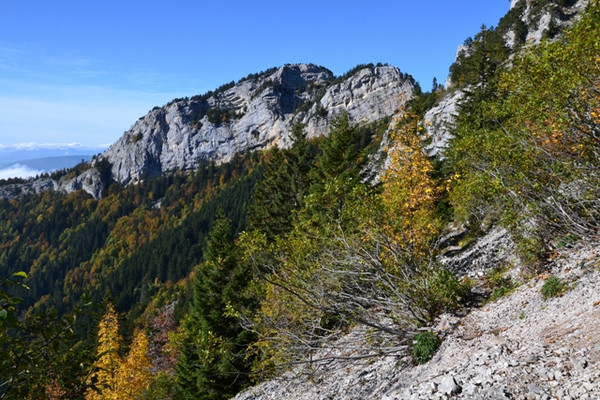 Vous progressez à flanc d’une pente assez sévère, en traversant plusieurs beaux pierriers ; la forêt s’éclaircit et vous atteignez « Molliet », alt. 1470. Poursuivez à droite, direction Col de l’Enclave. On continue à flanc de pierriers avec quelques arbrisseaux épars, le long de superbes falaises. Beau point de vue sur la Pierre Taillée et l’Enclave droit devant, le Parmelan, Usillon en bas et la plaine à l’Ouest. On rentre à nouveau dans la forêt où le sentier continue plus ou moins à plat; les feuilles tapissent harmonieusement le sol. Quelques petits passages peuvent être assez glissants, notamment lors du franchissement de deux ruisseaux, dont celui de la Plagne. Après le tronçon composé uniquement d’épicéas, on atteint « Les Grands Taillis », 1410 m. Continuez toujours direction Col de l’Enclave. Le sentier devient plus pentu et serpente en tirant franchement à droite, le long des falaises de l’Enclave. Après un petit tronçon assez sauvage, joliment arboré, vous rejoignez assez rapidement le Col de l’Enclave (1495 m) ; une harde de chamois fréquentent parfois la butte herbeuse derrière la maisonnette.
